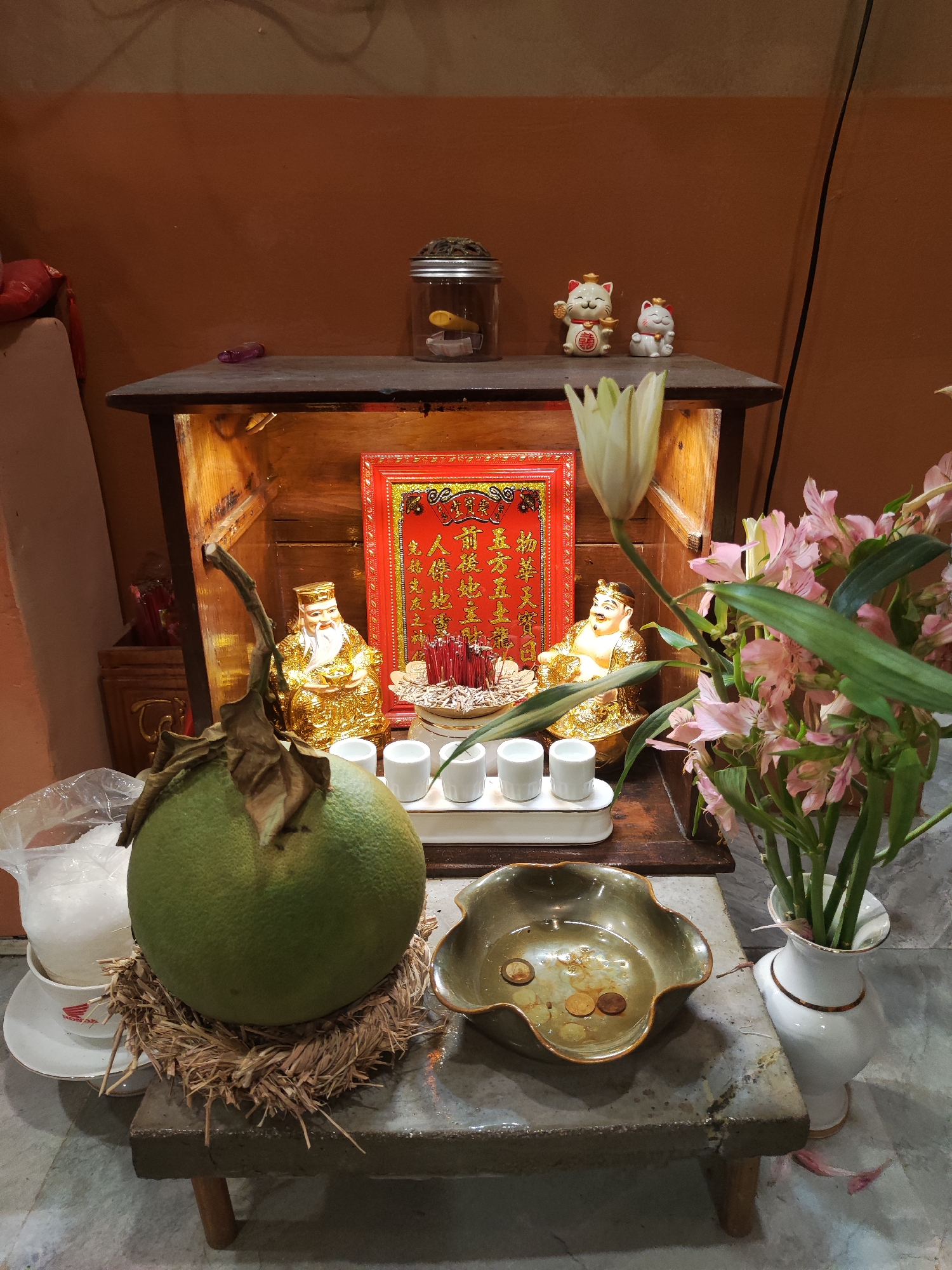 A photograph reveals a religious altar within an interior space, possibly a home, located in Da Lat, Vietnam. The altar, constructed of dark wood, features a red and gold sign with Vietnamese characters centered between two gold-colored figures, presumably deities. A row of small white cups sits below the sign. Incense sticks stand upright in a small dish in front of the sign. Atop the wooden altar, a glass jar containing small objects and two Maneki Neko, or beckoning cat figurines, are visible. In front of the altar, on a stone or concrete surface supported by wooden legs, sits a large green pomelo resting on a bed of dried straw. To the left of the pomelo, a plastic bag containing white matter rests on a saucer placed on top of a Honda-branded cup. To the right of the pomelo, a shallow ceramic bowl holds coins submerged in water. A white vase filled with pink alstroemeria flowers is also situated on the right side of the altar. The background wall is painted in a shade of brownish-orange. Other objects are partially visible behind and to the left of the altar.