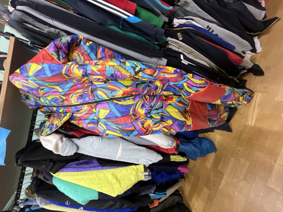 A pile of clothing rests on a rack. The garments are assorted colors and textures, including a vibrant, patterned jacket with red accents taking center stage. Various other items, such as pants and jackets, sit above and below the colorful piece. The rack and the items on it occupy a space with a light-colored, hardwood floor.