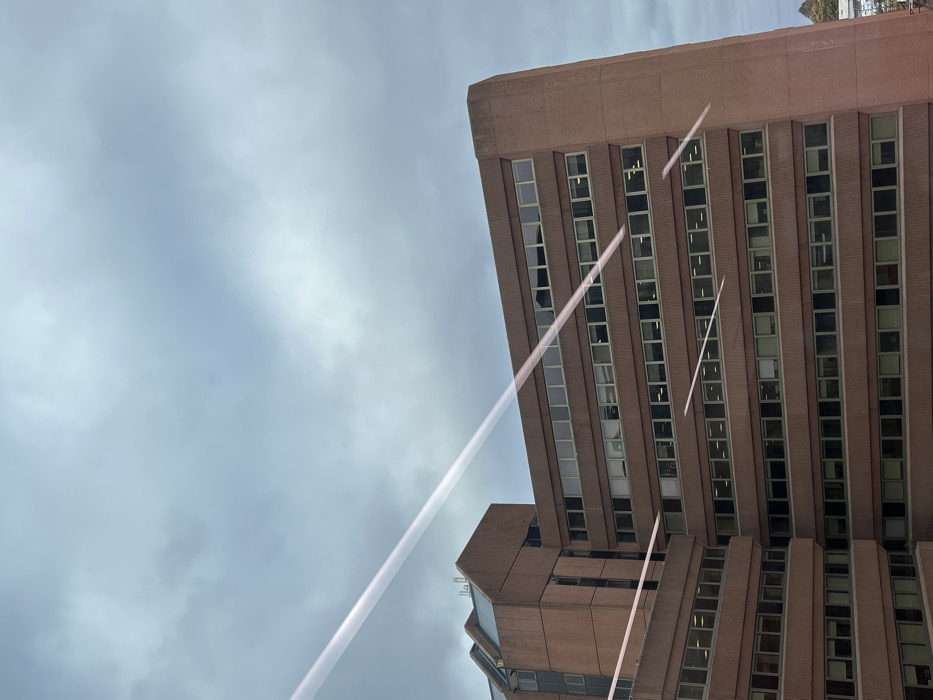 The image depicts an exterior view of a multi-story building under an overcast sky, located at the Building Research Establishment (BRE) site on Old Brickett Wood Lane, Garston, Watford, Hertfordshire, WD25 9XX, United Kingdom. The primary subject is a large institutional or office building, constructed with reddish-brown pre-cast concrete or brick-like panels. The structure features multiple levels, approximately five to seven floors are visible, characterized by numerous horizontal bands of rectangular windows with dark frames, some appearing reflective. The left portion of the building exhibits a terraced or stepped design, with upper sections receding, while the right portion presents a more uniform, flat facade. Minimal rooftop elements, possibly vents or equipment, are discernible against the sky on the left. The sky is largely overcast, displaying varying shades of light grey cloud cover with no direct sunlight visible. A prominent, bright, linear light streak runs diagonally from the upper left to the lower right across the image, likely a reflection on the glass surface from which the photograph was captured. Additional fainter, parallel linear streaks are present in the lower half of the image. No individuals, specific actions, or interactions are visible within the frame. The scene is static.