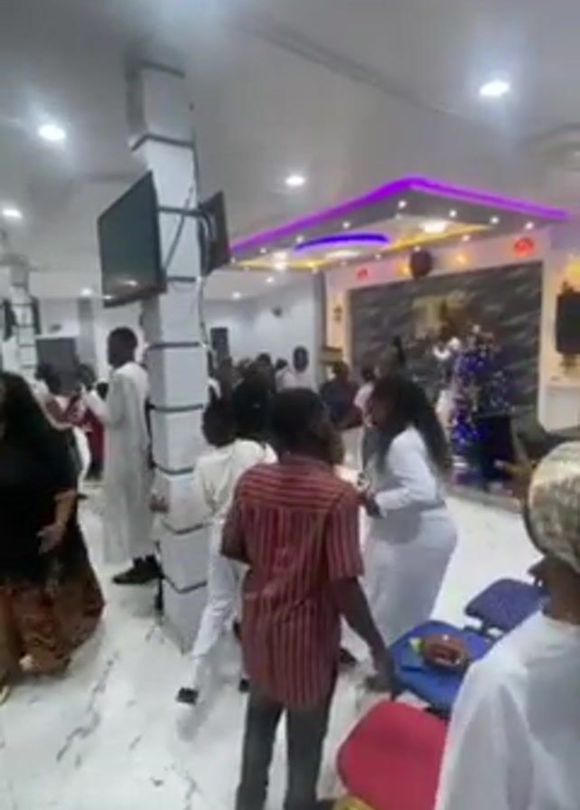 room full of people dancing to music. There are both adults and children in the room. Most of the adults are dressed in white, and some of the children are wearing white or red and white striped shirts. There is a Christmas tree in the corner of the room, and the ceiling is decorated with colored lights. The room is brightly lit and appears to be a church or community hall.