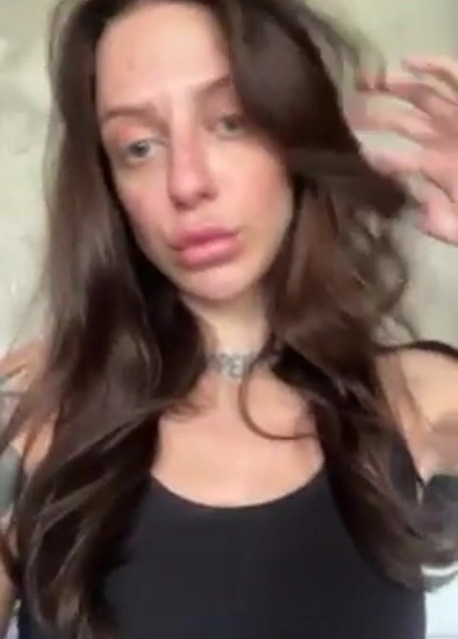 A woman with long brown hair, fair skin, and some visible freckles is shown from the chest up. She is wearing a black tank top. The woman touches her hair with her right hand and smiles subtly. She appears to be inside against a grey textured wall. A tattoo is visible on her right arm, and a tattoo is on her neck.