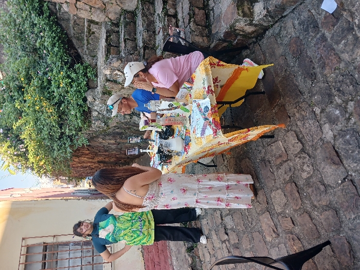 A group of four people is outdoors, possibly at a market or gathering. Three individuals are gathered around a table covered with a patterned cloth, displaying various items. Two are wearing hats and appear to be interacting with the items. A fourth person stands near a building, facing the group. The setting has stone stairs and walls, and a building with a window is visible.