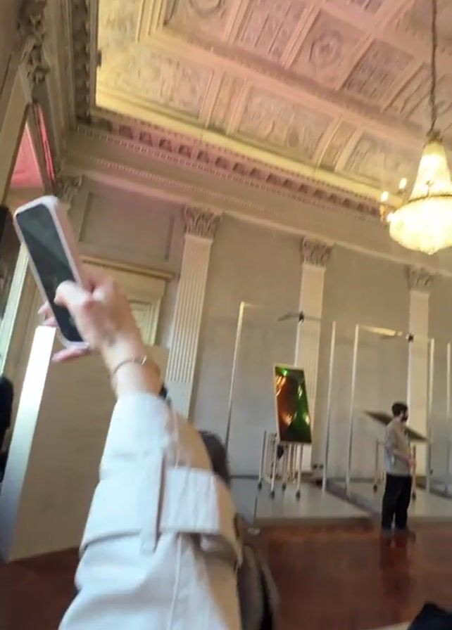 person holding up a smartphone to take a photo of the ornate ceiling of a room. The room has high ceilings with decorative moldings and two chandeliers. The walls are painted white or light grey. There are large windows in the room and some artwork on display, supported by stands. Several people are in the room, some of whom appear to be looking at the art or talking. The camera pans around the room, showing more of the ceiling and the people.