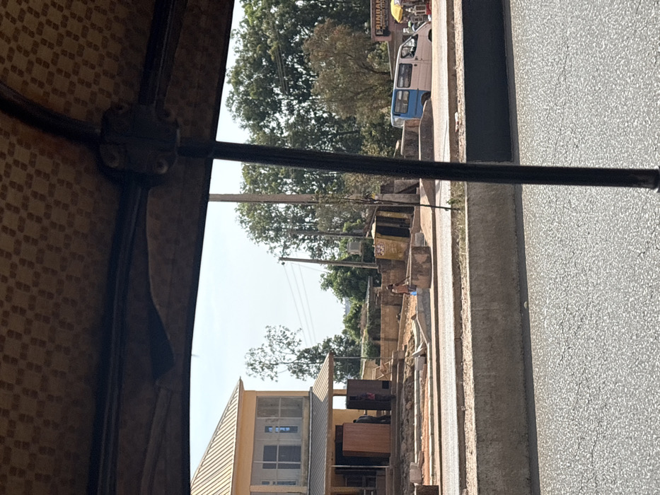 The image depicts a street scene in an urban or semi-urban area of Unknown, Nigeria, viewed from inside a vehicle with a patterned fabric ceiling