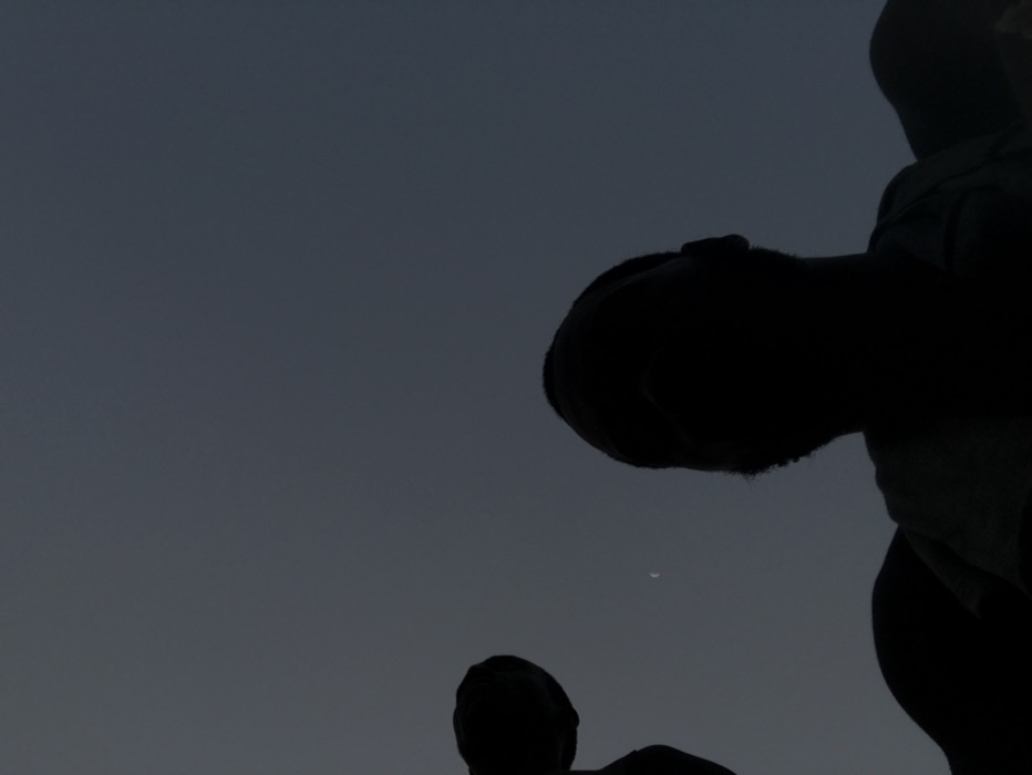 Silhouette of two people against a dark sky with a thin crescent moon visible. The perspective is from below, looking up at the figures. The details of the individuals are obscured, only their outlines are discernible. The person to the right is slightly closer to the viewer and is partially cut off by the frame. The person to the left is smaller and more distant.