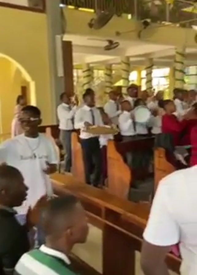 vibrant gospel performance in what appears to be a church. The camera starts inside the pews as attendees record with their phones. The focus then shifts to a group of young people in matching white shirts and ties playing instruments and singing. The room is brightly lit, with yellow and white pennants strung across the ceiling. The cameraman then pans to show an organist playing, as another person dances on top of a set of organs. Attendees in the pews are clapping, recording and dancing.