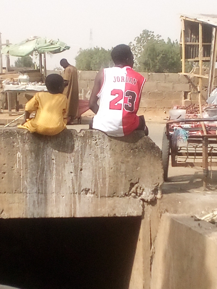 This image, captured in Tudun Murtala, Nigeria, depicts an outdoor scene under a hazy sky. In the foreground, an adult male and a child are seated side-by-side on a weathered concrete barrier, possibly part of a culvert, their backs to the viewer. The adult male wears a red and white sleeveless jersey with "JORDAN" and "23" printed on the back. The child, to his left, wears a yellow long-sleeved garment and holds a thin stick in their right hand. In the midground, to the left of the seated individuals, another adult, wearing a light brown tunic, stands facing away near a market stall. This stall is shaded by a light green umbrella, and a table beneath it displays various items in bowls. To the right of the concrete barrier, a wooden, open-sided structure and a metal-framed cart laden with assorted goods are visible. The ground appears unpaved and dusty. Sparse green vegetation and a distant transmission tower are present in the background.