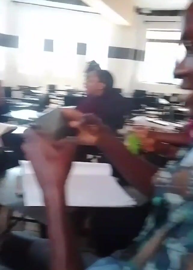 classroom setting with multiple students seated at desks. The room is brightly lit with natural light coming through several windows. The walls are painted in a light color, with some sections highlighted in darker tones. Most students are Black. They are either conversing with each other or focusing on their phones. Some have notebooks and pens on their desks. The camera appears to be held by someone seated among the students, offering a first-person perspective. The camera moves throughout the classroom.