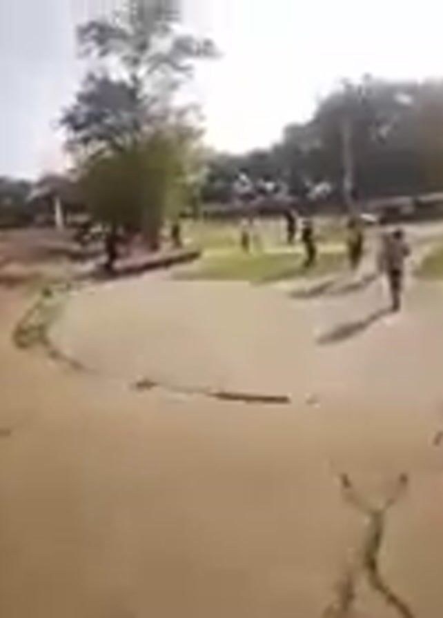 The scene appears to be a park or recreational area with a paved walkway and grass. There are several people dispersed throughout the area, some standing and others walking. The day appears bright and sunny, casting distinct shadows. There are trees bordering the scene, and what appears to be a construction zone to the left of the walkway. The camera is relatively still, capturing the environment from a slightly elevated perspective.