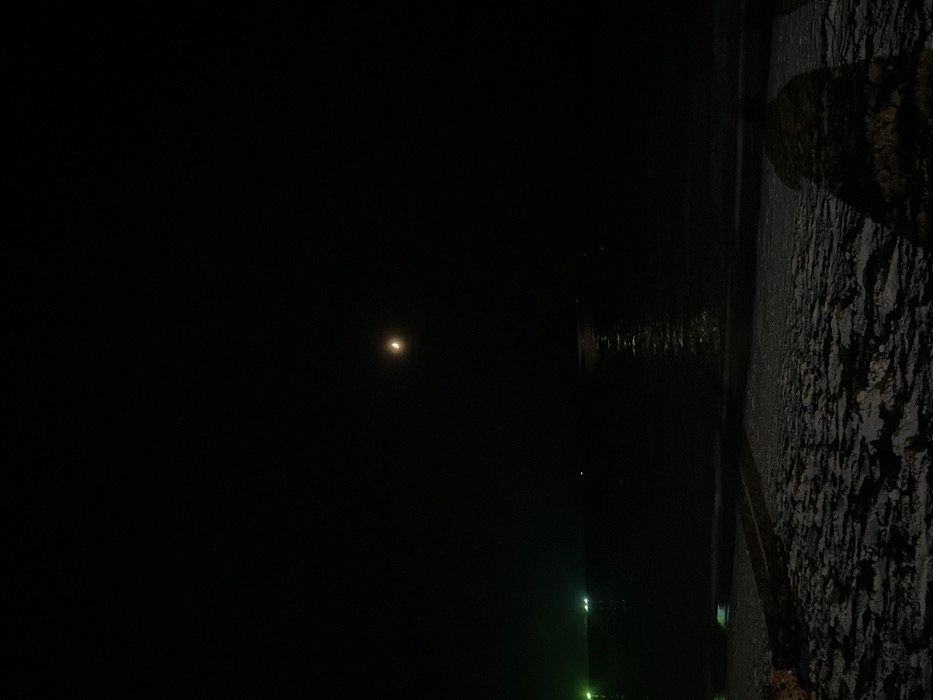 This image depicts a nighttime coastal scene in Baan Chaweng, Thailand. The sky is dark, featuring a distinct, illuminated crescent moon centrally positioned in the upper half. Below the horizon, a dark body of water, likely the sea, reflects the moonlight as a shimmering vertical path extending towards the lower-center. On the far left side of the water, multiple bright green lights are visible, indicating distant vessels or illuminated structures. The foreground consists of textured ground, consistent with sand or beach terrain, partially illuminated by ambient light. A dark, linear object, resembling a wooden beam or low barrier, is horizontally embedded in the sandy foreground, parallel to the water's edge. A distinct, dark shadow of an individual, presumably the photographer, is cast onto the sandy ground in the lower right corner, extending towards the left. No other persons, actions, or interactions are discernible.