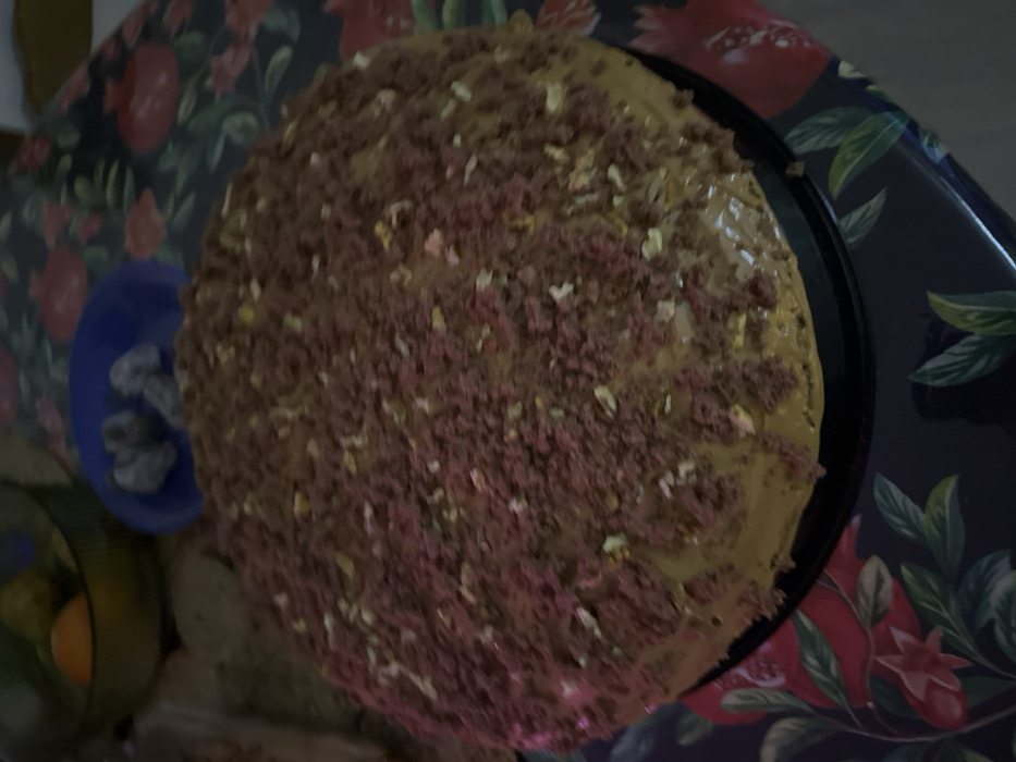 A close-up shot shows a round cake topped with light brown icing and sprinkled with small, dark pink and white bits. The cake sits on a black platter with a patterned floral rim. To the left, a small blue bowl contains what appears to be gray stones. Also, an orange and other blurred, circular objects are seen. The image exhibits poor lighting and is possibly blurred.