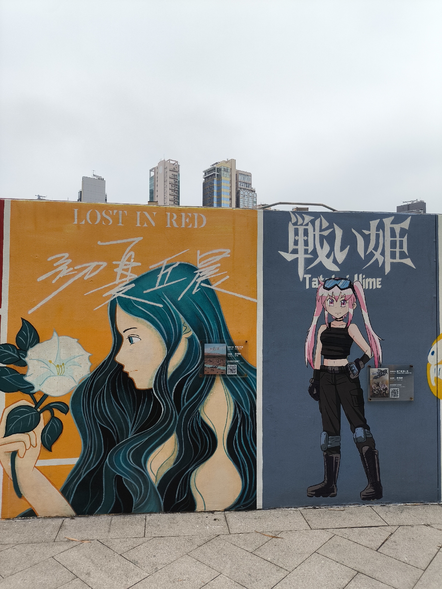 This image shows two adjacent murals on a concrete wall with a brick ground in front of it. In the background, several tall buildings are visible, suggesting an urban environment. The mural on the left is primarily orange, with the text "Lost in Red" written above a stylized drawing of a woman's face in profile. The woman has long, dark teal hair and is holding a white flower. Chinese characters are written below the English text. A small image and a QR code are attached to the lower right corner of the mural. The mural on the right is primarily blue-grey, with the text "Tactical Hime" above a full-body drawing of an anime-style female character. She has pink hair and is dressed in black tactical gear. Chinese characters are written above the English text. Similar to the left mural, a small image and a QR code are attached to the lower right corner of the mural. Based on the style and content of the murals, this scene is likely located in a vibrant part of the city of Hong Kong, China.