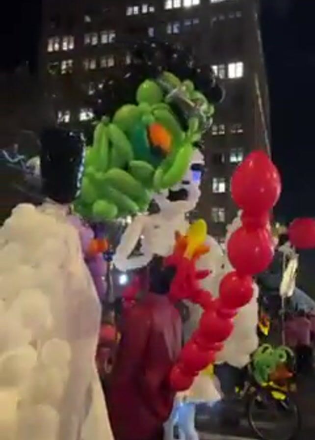 A night-time street parade features people wearing elaborate costumes made primarily of balloons