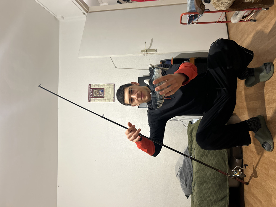 A young adult male is captured in a residential interior in Strasbourg, France. He is in a squatting position on a light brown wooden floor, facing the viewer with a neutral expression. He wears a black long-sleeved shirt with red sleeves visible underneath, black athletic pants, striped socks, and olive-green slide sandals. His left hand holds a black fishing rod, angled upwards and to the left, equipped with a reel near the base. His right hand holds a multi-segmented artificial fish lure, resembling a small dark-backed fish with a red hook, suspended by fishing line. The background features plain white walls. To the left, a bed with a dark green blanket and a gray pillow is partially visible. Centered behind the male is a calendar labeled "CALENDAR BOUDDHISTE 2025" displaying a religious icon. To the right, a white closed door with a silver handle is present, and a partial view of a red metal-framed object is visible on the far right. The room is lit by an unseen overhead light source.