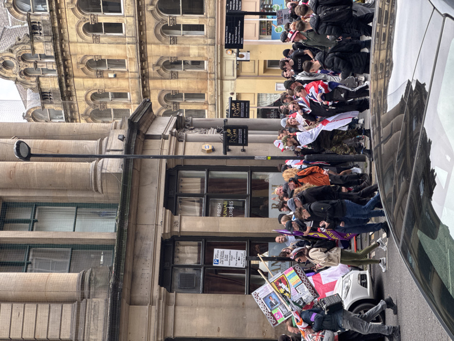 This image depicts a daytime scene on Dean Street in Newcastle upon Tyne, United Kingdom, specifically in front of the Rahi Punjabi & Indian Kitchen restaurant. A large group of individuals, predominantly adults, is seen marching or walking in procession from left to right across the frame. Many participants are either draped in or carrying flags. The Flag of England (St. George's Cross, white with a red cross) is prominent, displayed by numerous individuals. The Union Flag (Union Jack) is also visible. One person on the far left carries a large, homemade-looking rectangular sign on a pole, featuring multiple small, colorful screen-like panels with various depicted images and text. Another individual nearby holds a dark, small electronic device. A distinctive individual in the mid-ground wears camouflage-patterned trousers, a dark vest, and is dramatically draped in an England flag like a cape. A woman beside him is also draped in an England flag, and another woman centrally located carries a Union Flag over her shoulders. The group's attire is casual, including jackets, hoodies, and hats; some hats feature the England flag motif. In the foreground, the dark roof of a vehicle is visible, showing reflections of the overhead scene. A white car is partially visible on the far left, behind some of the marchers. The background features multi-story urban architecture. On the left, a classical stone-clad building, housing the Rahi restaurant on the ground floor (indicated by "FRESH PUNJABI CURRIES" and a "RAHI" sign), displays large columns and windows, some protected by green netting on the upper floors. A "Pay to Park" sign and an ADT security box are affixed to this building. To the right, another ornate, lighter-colored stone building with multiple arched windows and decorative elements contributes to the city's historical urban landscape. A black lamppost stands vertically in the mid-ground. Further down the street, various commercial establishments and a white street sign pointing to "Swing Bridge" and "Quayside" are discernible. The sky appears overcast.