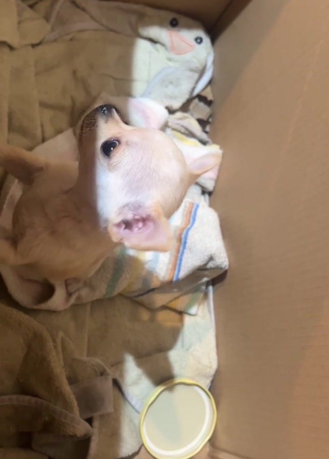 small, light-colored Chihuahua puppy in a cardboard box lined with towels