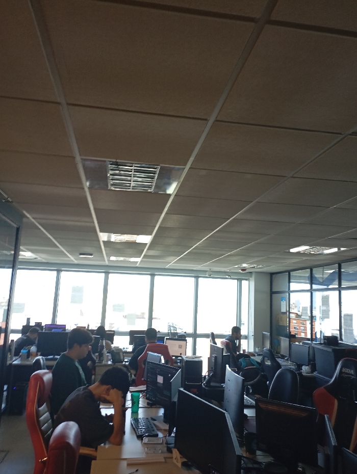 The image displays an open-plan office environment located within a high-rise building in Buenos Aires, Argentina. The perspective is slightly elevated, looking down into the workspace. The scene is illuminated primarily by natural light streaming through large, multi-pane windows that form the far wall, revealing a dense urban cityscape beyond. Overhead, a suspended beige acoustical tile ceiling is visible, featuring a grid system, recessed fluorescent light fixtures, and air vents. Approximately 10 to 15 individuals, appearing to be young to middle-aged adults, predominantly male, are seated at individual workstations arranged in rows. Each workstation typically consists of a light-colored desk, an ergonomic office chair (some are distinctly red and black gaming-style chairs, one with "KDA" branding), and one or more desktop computer monitors with associated peripherals such as keyboards, mice, and CPU towers positioned under desks. Individuals are generally facing their monitors, indicating engagement with computing tasks. One individual in the foreground-middle, wearing a dark shirt, rests his head on his hand on the desk, adjacent to a green drinking vessel. A clear glass partition is visible along the left side of the frame, delineating another area. The office appears functional and equipped for technology-focused work.