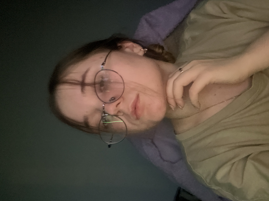 A dimly lit, close-up indoor portrait captures a young female, facing slightly left of the viewer, with her head angled upwards. She has light skin, light brown hair, and wears round, thin-framed eyeglasses. A prominent green vertical light reflection is visible on her left eyeglass lens. She has a small stud piercing on her left nostril. Her attire includes a light-colored, possibly olive green or beige, t-shirt, and a delicate chain necklace is visible. Her left hand is raised, with fingers curled, resting against her chin and jawline. Her fingernails are manicured with a light polish. She wears a ring with a dark stone on her right ring finger and a small hoop earring in her right ear. The background is dark and indistinct, with a soft, light purple textured fabric visible behind her right shoulder and head. The specific location within the city of Pushchino, Russia, cannot be determined from the visual information presented in the image.