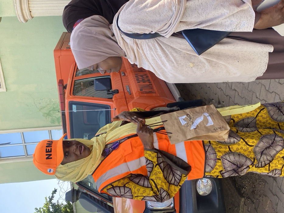 The image portrays an outdoor interaction between two adult females in Unguwar Sarki, Nigeria, adjacent to an orange emergency vehicle. The woman on the left, identified as affiliated with NEMA (National Emergency Management Agency), wears an orange baseball cap with "NEMA" branding, a yellow headscarf, a patterned yellow and black long-sleeved dress, and an orange high-visibility vest with white reflective stripes. She holds a brown paper bag marked "S BGANICS" and "75552" in her left hand and gestures with her raised right hand. The woman on the right wears a light beige headscarf and a matching shawl over a brown garment, carrying a dark shoulder bag, and is attentively facing the NEMA-affiliated woman. A third individual is partially visible behind the woman on the right. The background features an orange Toyota Land Cruiser emergency vehicle with "NATIONAL EMERGENCY MANAGEMENT AGENCY" printed on its side and emergency lights mounted on its roof. Behind the vehicle, a light green building with windows and a white fluted column are visible. A barbed wire fence is discernible in the upper left. The ground is paved, and the scene is brightly lit by daylight.
