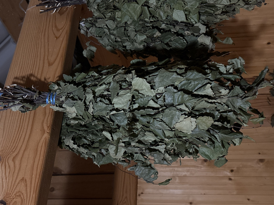 - "Bundles of dried birch branches, secured with blue bands, hang against a wooden wall" by FM-qDnq83, licensed under CC BY 4.0