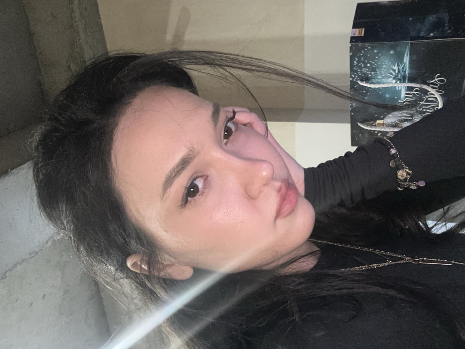 A young woman with long, dark hair and fair skin is posing for a photo. She is wearing a long-sleeved black shirt and a necklace. A bracelet with charms adorns her wrist. Her makeup is natural, highlighting her eyes and lips. She is looking at the camera with a slight pout. The background is slightly blurred but appears to be an interior setting.