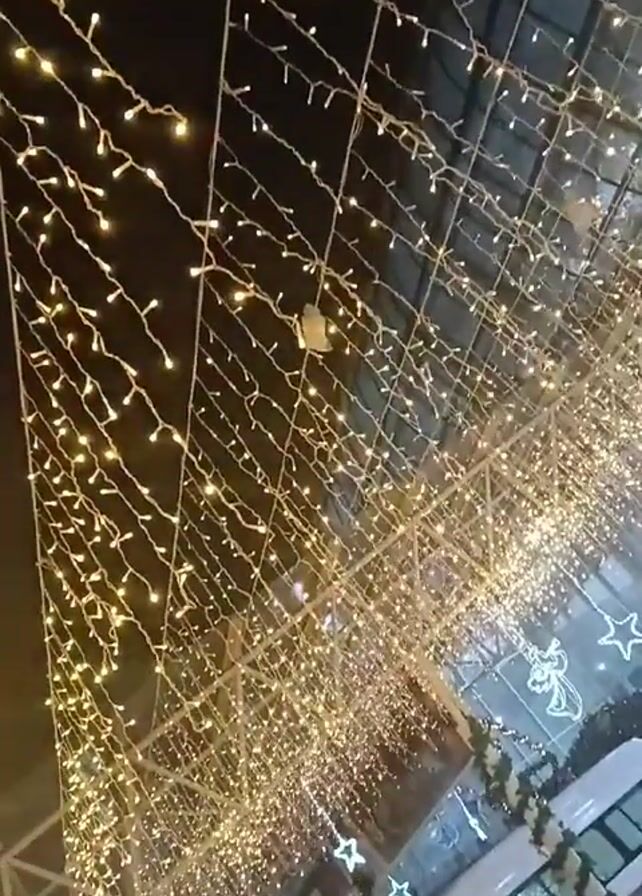 The video depicts a low-angle view of an outdoor space illuminated with numerous string lights. The lights are arranged in a grid-like pattern overhead, creating a canopy of warm, yellow light. Below, the scene appears to be a street or plaza, but details are limited due to the angle and lighting. A white bus is visible, adorned with star-shaped decorations and the word "Eight". The overall impression is a festive, nighttime scene.