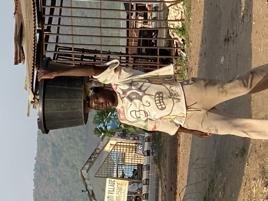 An adult individual, appearing male, walks forward on a dusty dirt path in Adankolo, Nigeria. They are carrying a large, black, cylindrical plastic bucket balanced on their head, stabilized by their raised right hand. A light-colored, fibrous material is visible between the bucket and the individual's head. The individual wears a light-colored, short-sleeved shirt patterned with colorful, stylized graphic faces and the word "WEOW," along with light-brown drawstring trousers showing visible stains or dirt. In the mid-ground to the left, a light-colored building with a dark, barred gate is partially visible. A sign nearby reads "KITI VILLAGE" and "ISING ESTATE." A paved road with black and white striped traffic barriers runs in front of this building. To the right, an open-air structure constructed from metal rebar framing and corrugated metal sheets is present. The distant background features a large, green, tree-covered hillside or mountain range under a clear sky. Direct sunlight illuminates the scene, casting shadows on the ground.