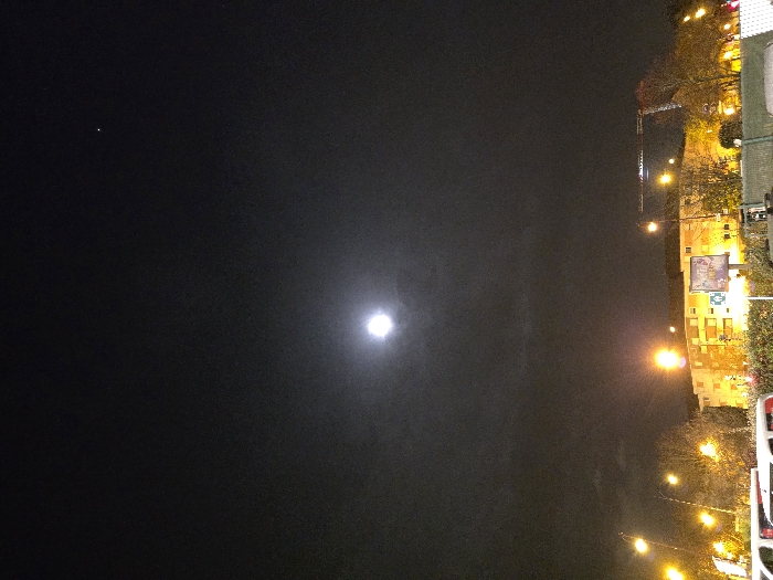 A night scene shows a cityscape against a dark sky. A bright moon is centered in the frame. Building lights and street lamps illuminate the right side of the image, creating a contrast with the dark sky. Trees are visible along the street. A few brighter building facades and signs add visual interest.