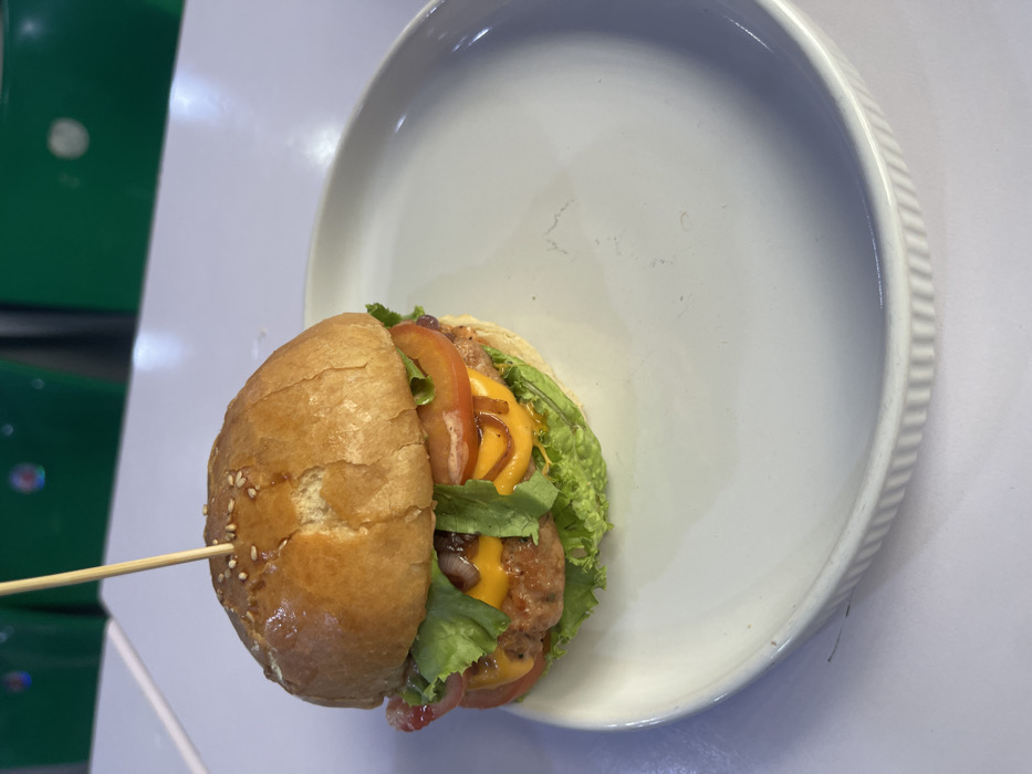 - "A single, fully assembled hamburger rests on the left side of a white, circular plate with a ribbed rim" by FM-6wY0i1, licensed under CC BY 4.0