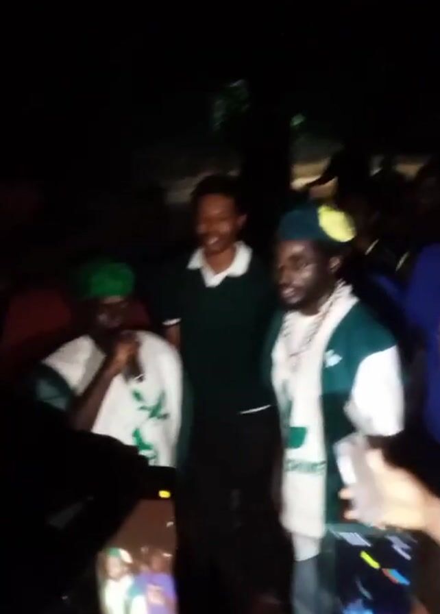 The video appears to be shot outdoors at night, focusing on a small crowd gathered around two men dressed in matching green and white attire