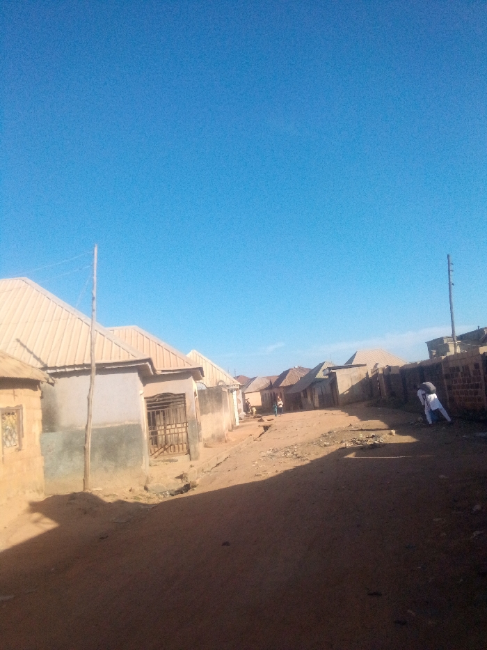 The image depicts a residential street in Bukuru, Nigeria, under a clear, bright blue sky