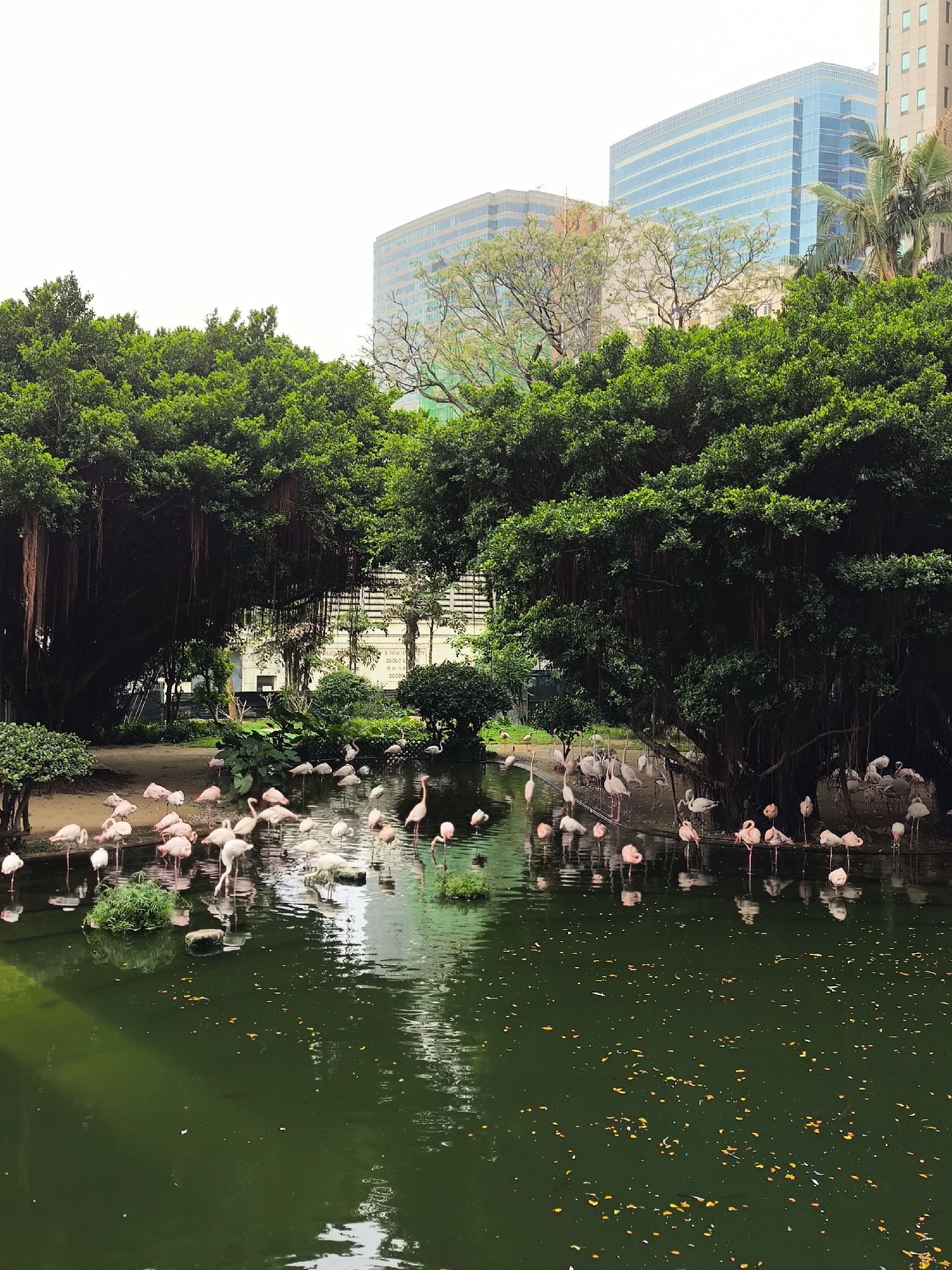 The image depicts a pond populated with flamingos in a park setting. Lush green trees frame the pond, with a backdrop of modern high-rise buildings. The water is dark green and reflects the surrounding trees and the bodies of the birds. Fallen leaves speckle the surface of the water. The scene is likely located in Hong Kong Zoological and Botanical Gardens in the city of Hong Kong, China.