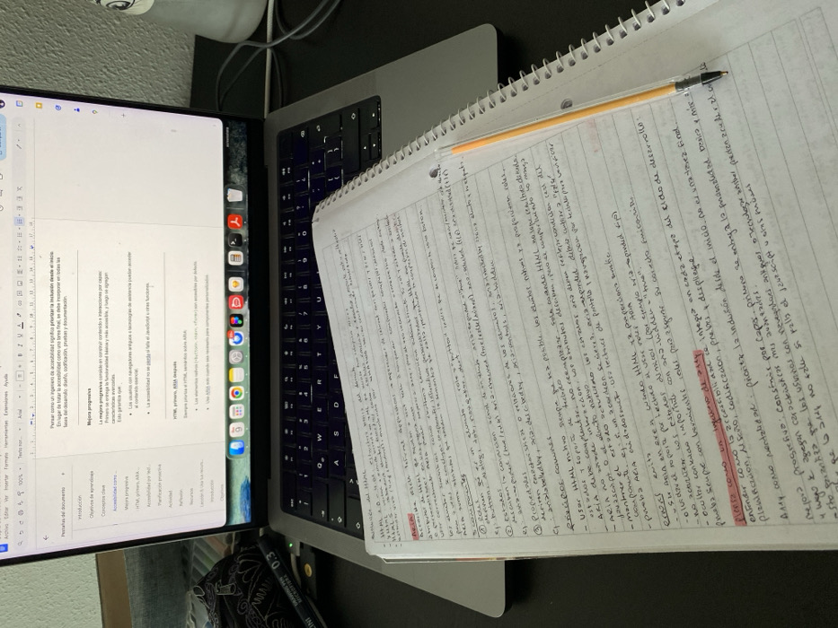 The image depicts an indoor study or work setup situated in Gijón, Spain. A silver-gray Apple MacBook laptop is open and powered on, occupying the upper half of the frame. Its screen displays a document, likely in Microsoft Word, featuring content in Spanish related to web accessibility, HTML, and ARIA. The laptop's keyboard, featuring a QWERTY layout with Spanish characters, is visible beneath the screen. Directly in front of the laptop, an open, spiral-bound notebook with white ruled pages is positioned. The notebook contains handwritten notes in black ink, also in Spanish, covering topics identical to those on the laptop screen, with some sections highlighted in red. A yellow and orange BIC ballpoint pen rests diagonally across the right page of the notebook. To the left of the laptop, a black drawing pen marked "MICROFIL 0.3" is visible, alongside a glimpse of dark fabric. To the right, a white object, possibly a bottle, and a white cable are partially visible. The objects rest on a dark, uniform surface, likely a desk.