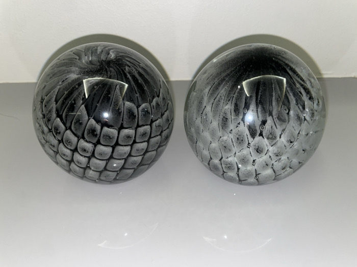 Two spherical, decorative objects are displayed side-by-side on a reflective, light-colored surface, against a plain, light-colored background wall. Each object, likely crafted from glass, features an intricate internal pattern of dark and light grey tones. The pattern at the top of each sphere consists of fluid, swirling lines, transitioning downwards into a distinct, textured grid resembling scales or cellular structures. The left sphere exhibits a predominantly darker hue in its pattern compared to the lighter, more diffuse tones of the right sphere. Reflections from an unseen light source are evident on their polished surfaces and on the underlying display surface. This scene is located in Durban, South Africa.