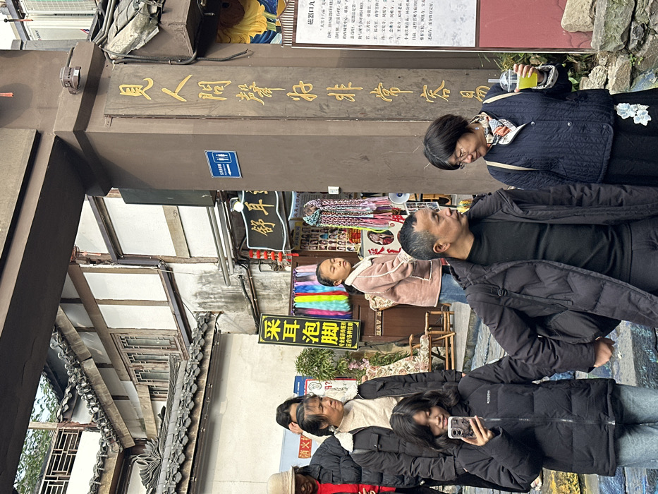 An outdoor scene captures pedestrians passing beneath traditional architecture. A brown beam with golden lettering arches overhead, next to a restroom sign. Shop signs advertise services like ear cleaning and foot massages in Chinese characters. The architecture suggests a historical district or tourist area. People dressed in casual attire mill about, with one individual holding a drink. The scene captures a blend of commerce and cultural heritage.