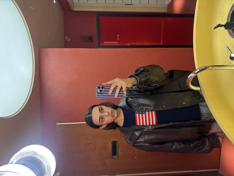 The image depicts a person taking a mirror selfie in a restroom located at The Bureau by The Cascade (Պարտեզ), Yerevan, Armenia. The subject is a young individual with dark, shoulder-length hair, wearing a dark brown leather jacket over a navy blue sweater featuring a prominent American flag design across the chest, and light grey sweatpants. They are holding a smartphone with a vertical striped purple and light blue case in their right hand, angled to capture their reflection. The environment is characterized by distinct design elements: The walls are painted a matte reddish-brown or terracotta color. On the left, a reddish-brown door features a horizontal rectangular window. On the right, a bright red door with a black frame is visible. Overhead, two light fixtures are present: a large, circular, recessed light and a cylindrical fixture with concentric rings on the left. A unique, bright yellow, circular basin sink occupies the foreground, fitted with a chrome gooseneck faucet and a black pump-style soap dispenser. The floor appears to be a dark reddish-brown, consistent with the wall color. A small, circular brass fixture is mounted on the red wall above and to the right of the red door.