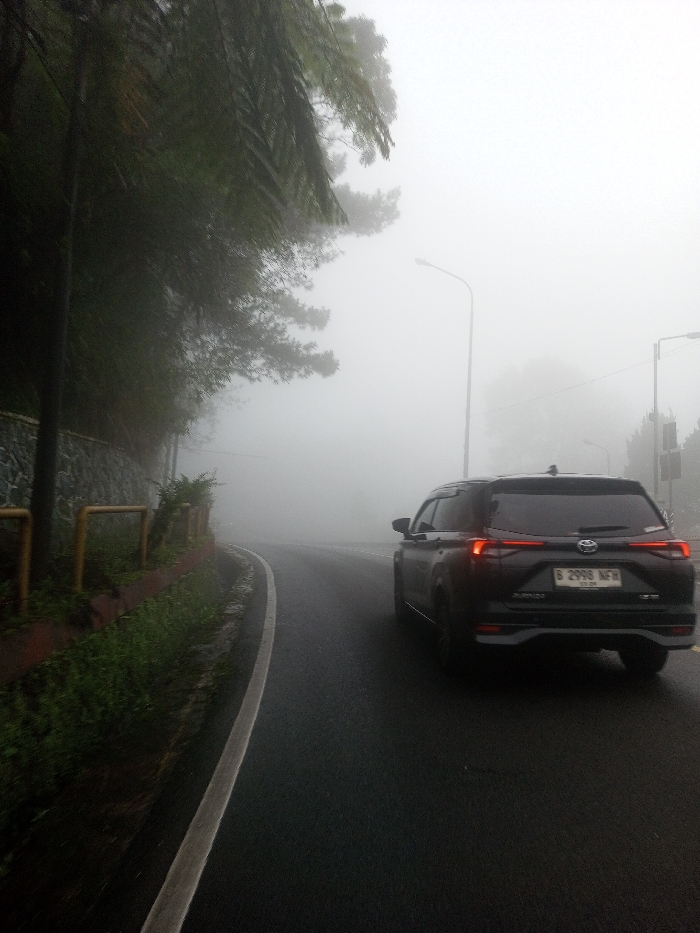 A dark-colored SUV is depicted from its rear-left on a wet, asphalt road heavily enveloped by dense fog. The vehicle displays an Indonesian license plate, 'B 2998 NFH', and its red taillights are illuminated. The road curves gently to the right, with a continuous white line marking its left edge. To the immediate left of the road, a stone retaining wall is visible, topped by a low yellow horizontal barrier. Behind this barrier and wall, a steep incline is covered in lush green vegetation, including prominent fern fronds and various trees, which fade into the fog. Multiple streetlights are faintly visible extending into the mist along the roadside, their structures largely obscured by the heavy atmospheric conditions. No individuals are present. The dense fog significantly reduces visibility throughout the scene, creating a diffused, monochromatic environment. Based on the license plate, the scene is located in Indonesia.