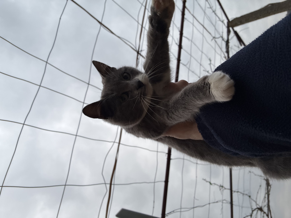 - "A grey and white domestic cat is held aloft by a human hand against an overcast sky in Pastrogor, Bulgaria" by FM-y3z5o2, licensed under CC BY 4.0