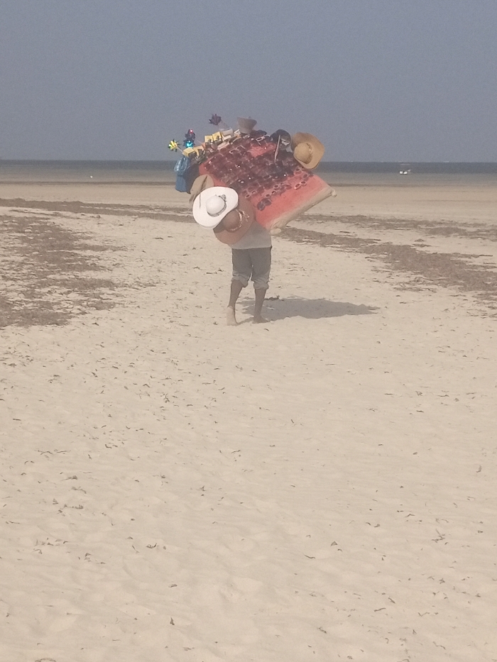 On a hazy day in Shanzu ward, Kenya, a single individual is observed from behind, walking across a sandy beach towards the ocean. The person, an adult, is barefoot, wearing dark knee-length trousers and a light-colored shirt, and casts a short shadow to their left. They are carrying a large, rectangular display board on their back, approximately 1.5 meters wide, predominantly red with numerous pairs of sunglasses attached. Secured to this display are several straw hats, including one white and two brown, along with assorted merchandise like colorful pinwheels and small blue bags. The foreground consists of light beige sand with scattered patches of dark brown seaweed or debris. The midground shows more concentrated patches of the same material. The background features a calm, shallow ocean, light blue-grey in color, meeting a hazy, light grey sky at the horizon. A small, indistinct light-colored object is visible on the water's surface in the far distance.