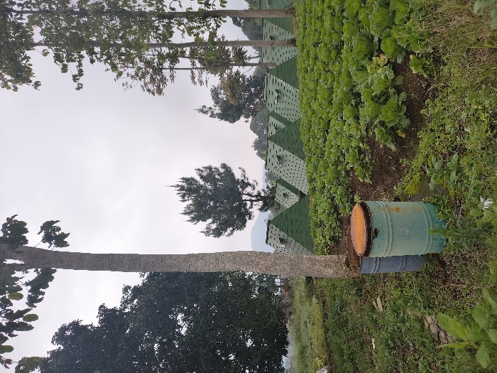 This image depicts an agricultural scene in An Khe Ward, Vietnam, under an overcast sky. In the foreground, a prominent light-barked tree trunk rises on the left. At its base, two metal drums are visible: the front drum is teal with a rusted orange lid, and the rear drum is a muted grey. The immediate ground is covered with sparse grass and weeds. To the right of the tree, a cultivated field of uniform green leafy plants, likely a brassica crop, extends across the midground. Beyond the field, a row of identical, small, pyramid-shaped structures with green shingle roofs and small circular vents are visible. In the background, additional trees of varying species are scattered, and hazy mountain outlines are discernible against the grey sky. There are no people present in the scene.