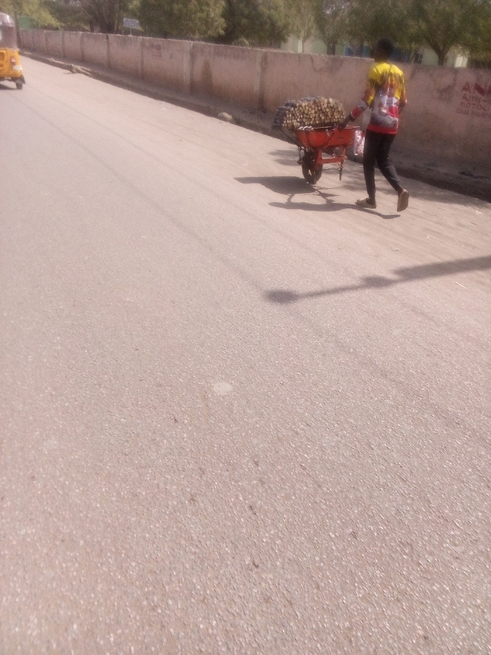 The image depicts a daytime scene on a paved road in the city of Dakata, Nigeria. In the midground, an individual, seen from behind, walks from right to left, pushing a red two-wheeled handcart heavily laden with numerous short logs or bundles of wood. The person wears a yellow long-sleeved shirt with red and white patterns, dark trousers, and light-colored footwear. A prominent shadow of the person and cart extends onto the light-colored asphalt road in the foreground. To the left, a yellow auto-rickshaw is partially visible on the road in the background. Along the right side of the road, a low, light brown concrete wall runs parallel, with some illegible graffiti on its surface. Green foliage is visible behind the wall, under a clear sky.