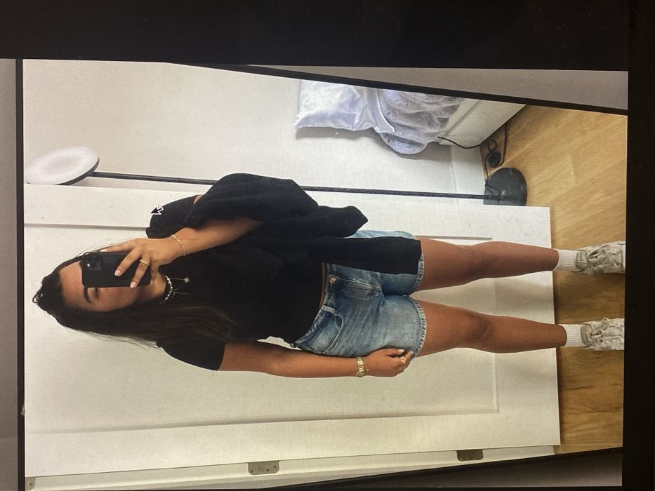 A young woman takes a mirror selfie indoors. She wears a black t-shirt, denim shorts, white socks, and sneakers. A black jacket is draped over her shoulder. She has a cell phone held up to obscure her face. Her dark hair is down. A ring light is visible to the left. Behind her are white walls, a white shelf with a folded white cloth, and a light wood floor.