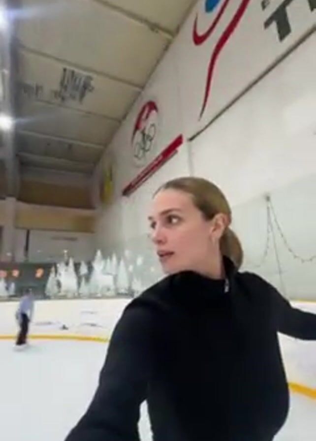 The video is taken from a first-person perspective, following a woman with blonde hair pulled back in a ponytail as she ice skates