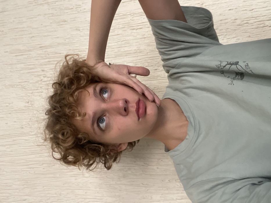A young individual with fair skin, short, curly light brown hair, and blue eyes is depicted in a medium close-up, gazing upwards and to their right