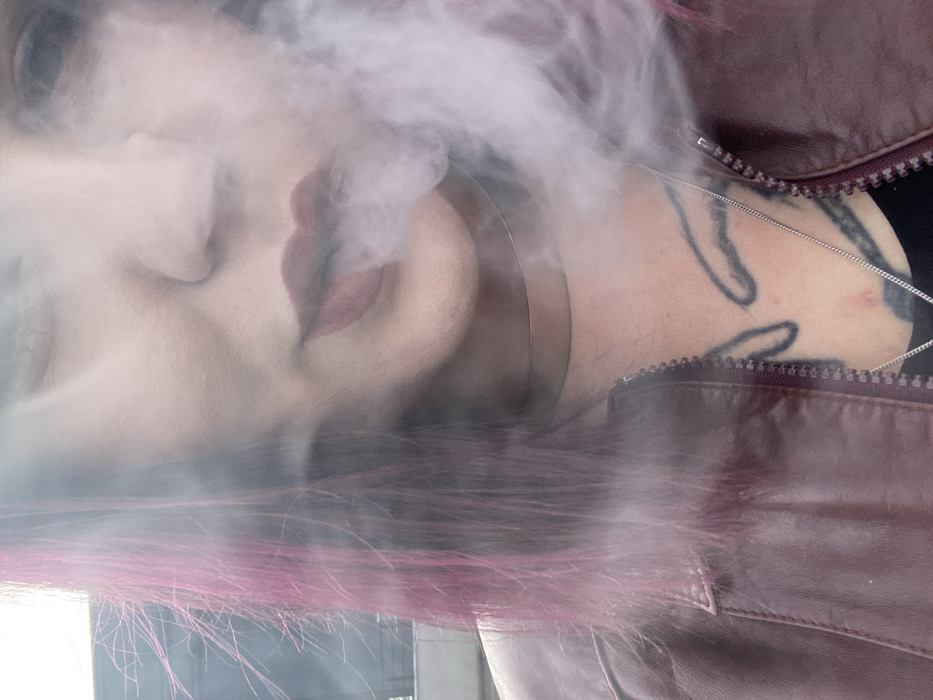 An individual is depicted from the mid-chest upwards, exhaling a dense plume of white vapor or smoke from pursed lips coated in dark red lipstick. The scene is outdoors in the city of Tomba, Montenegro. The subject has fair skin and magenta-colored hair visible on the left side, falling over the shoulder. A thin, metallic choker is worn around the neck, and a silver-colored chain necklace with a small pendant is visible over a black garment. A tattoo, consisting of abstract black lines, is visible on the upper chest, along with several small red blemishes. The individual wears a partially unzipped reddish-brown leather jacket over a black undergarment. The right eye is partially visible and appears closed or squinted. The background is light and indistinct.