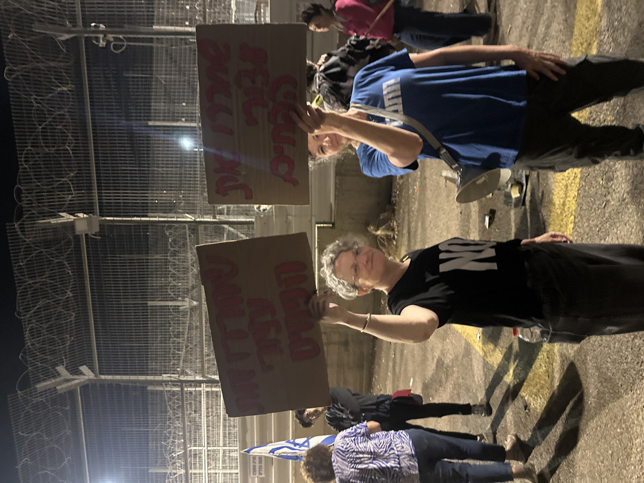 The image depicts a nighttime scene in the city of Unknown, Israel, showing a group of individuals gathered on an asphalt surface in front of a high security fence. The fence, constructed of multiple layers of metal mesh, is topped with extensive coils of razor wire (concertina wire) and supported by vertical metal posts. A white sign with black Hebrew text and a black border is affixed to the fence on the left side. Overhead lighting illuminates the area. In the foreground, two women are prominently featured, facing the camera and holding cardboard signs with handwritten pink Hebrew text above their heads. The woman on the left, with short grey curly hair and glasses, wears a black t-shirt with the word "NO" in white lettering and dark pants. A clear plastic water bottle is visible in her left pocket, and she wears a light-colored bracelet on her right wrist. The woman on the right has dark wavy hair and wears a blue t-shirt with a white "PUMA" logo and dark cargo pants; a grey megaphone is slung over her left shoulder. Both women exhibit slight smiles. Behind these two individuals, other people are visible. To the left, a person with dark curly hair, wearing a black hoodie and dark pants, stands with arms crossed, partially obscured by another individual wearing a white and blue patterned top. Further back and to the right, a woman in a pink top holds a pole or stick, facing away from the camera. A blue and white Israeli flag, mounted on a pole, is partially visible to the left, behind the group. The ground consists of asphalt with faded yellow painted lines.