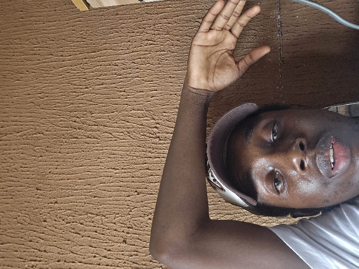 A person with dark skin, wearing a cap and a white t-shirt, looks into the camera. Their arm extends upward, hand open. The person’s face appears moist or sweaty. The background features a textured wall of a warm brown color. A portion of a ceiling, likely wooden, is visible in the upper left corner. A wire runs along the top right.