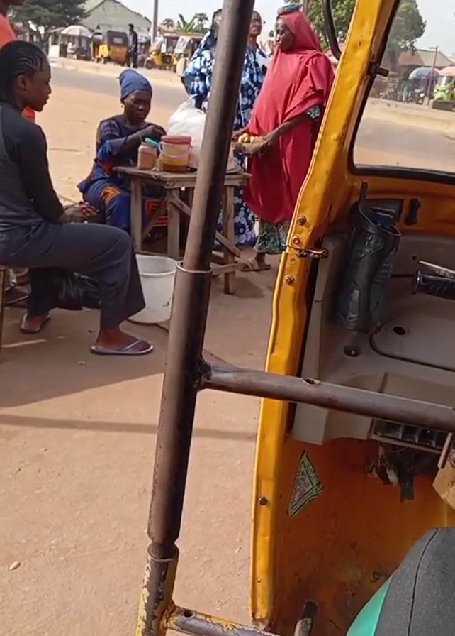 street scene in an African country. The view is from inside a yellow auto rickshaw. Several people are visible around a small wooden table where a woman in a blue dress is seated, pouring a liquid from a small pitcher into a container. A woman in a red headscarf and dress stands nearby. A few other people are in the background, and a woman in a grey outfit sits on a wooden stool looking on. Other vehicles can be seen on the road in the distance. The road surface is a reddish-brown color. The sky is clear and light blue.