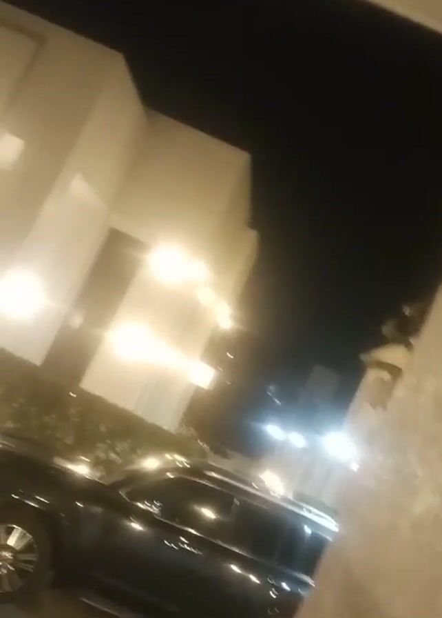 The video depicts an exterior view at night, focusing on a light-colored, modern building with several illuminated lights along its facade. A black SUV is parked in front of the building, partially obscured by shrubbery. The camera angle is low and tilted upwards. The overall lighting is dim, with the building's lights providing the main source of illumination. The focus appears soft, and the footage is somewhat shaky.