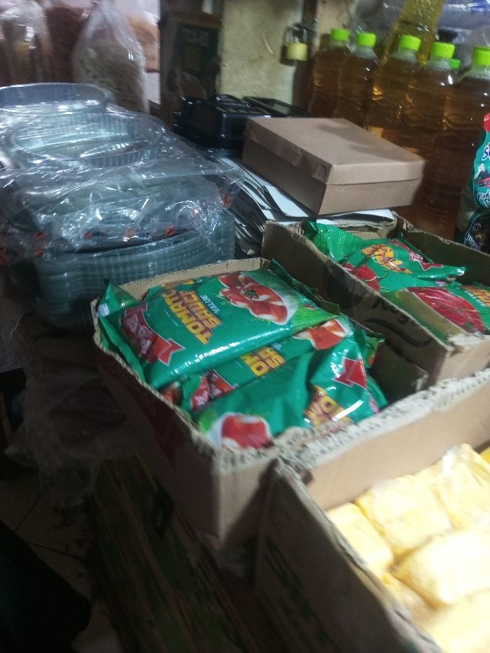 cluttered store shelf. Stacks of plastic-wrapped plates sit beside boxes. Two cardboard boxes overflow with pouches of tomato sauce, labeled with a green design. Another box holds small, yellow objects. In the background, cooking oil bottles with green lids line the back shelf, along with a brown cardboard box and other indistinct items. The overall scene is disorganized, reflecting a typical shop setting.